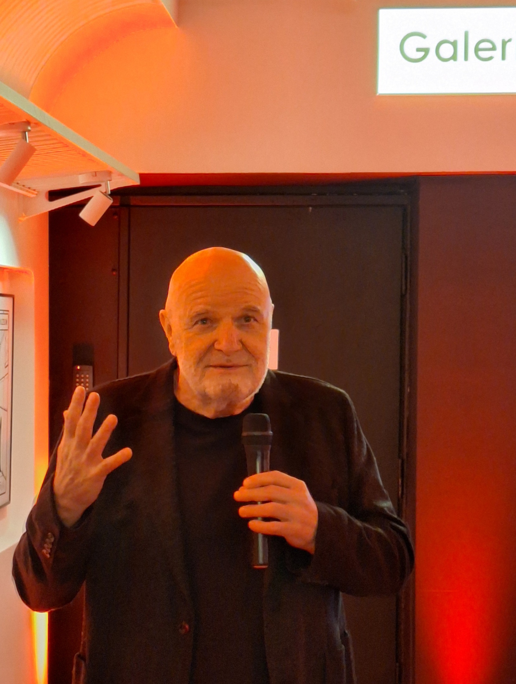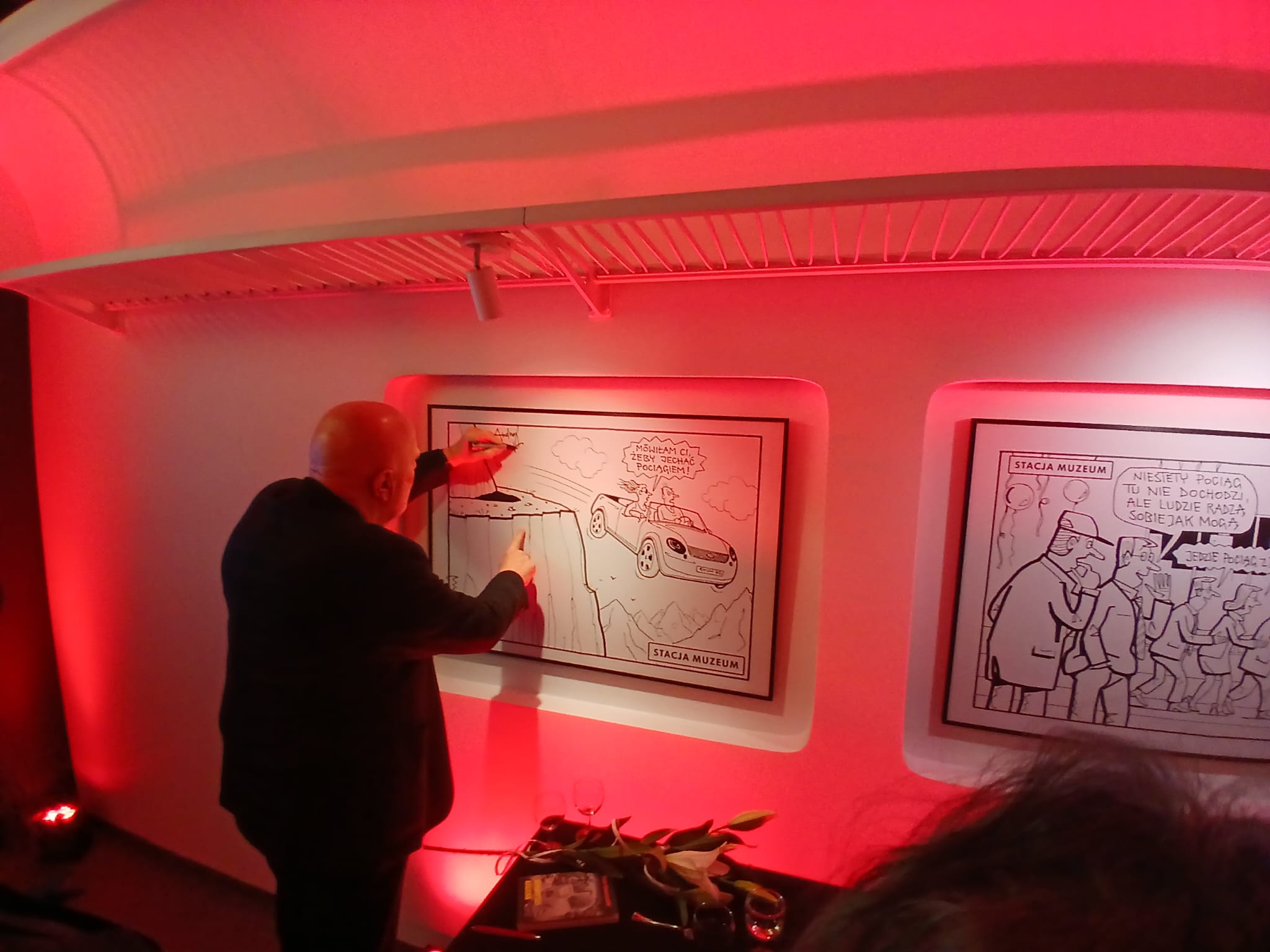 Następnie goście mogli wysłuchać przemówienia samego autora, który podzielił się anegdotami, dotyczącymi tworzenia grafik. Andrzej Mleczko podkreślił też, że sam lubi jeździć pociągami, ale martwi go skrócenie czasu podróży… Uczestnicy wydarzenia mogli także porozmawiać z mistrzem rysunku oraz uzyskać jego autograf.